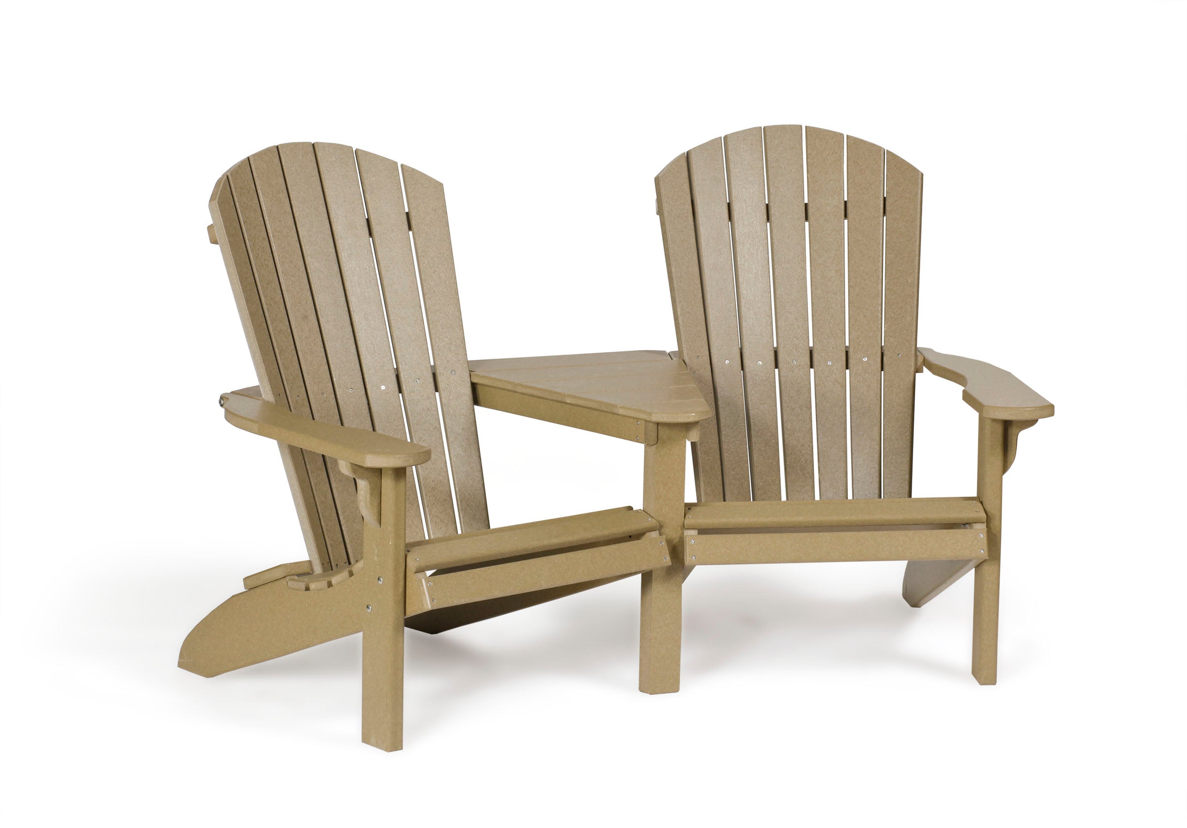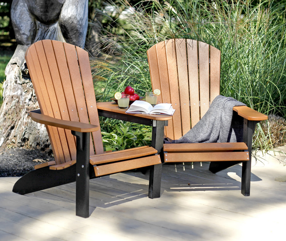 Our Fanback Adirondack Settee features a cozy look and feel to this adirondack tete-a-tete seating. The perfectly situated attachment table creates a quaint settee for two. It is constructed of solid HDPE lumber that's available in a variety of attractive, fade-resistant colors. It won't splinter, crack, chip, peel or rot and it never needs to be painted, stained or waterproofed. It's also designed to withstand nature's elements as well as to resist stains, corrosive substances, salt spray and other environmental stresses. Best of all, this furniture is made in the USA and backed by a 20-year warranty.