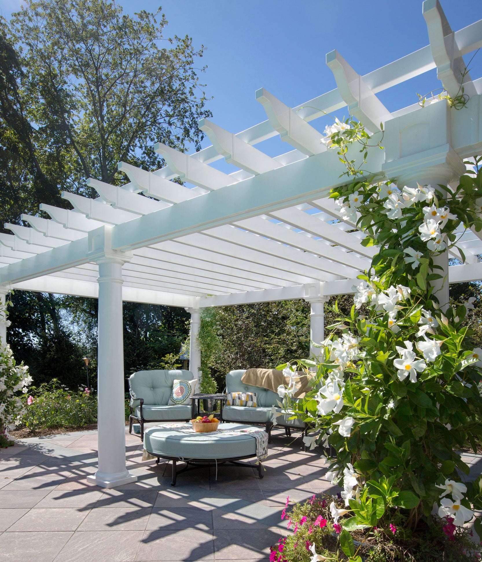 Our pressure treated wood structure is covered in a white maintenance-free vinyl to provide long life and superior strength. The 5x5 wood posts support the structure, with 1½" x 5½" joists spanning the short side and 1½" square runners on the longer side. Both sides feature decorative end caps: scalloped on the short sides and diamond on the others. Rigidity is provided by the heavy duty double header comprised of 2x6 boards. The pergola mounts to any concrete pad or wood deck with the included mounting brackets. You can rest easy as our Vinyl Pergolas are practically maintenance free, and are designed with the safety and enjoyment of your family in mind.