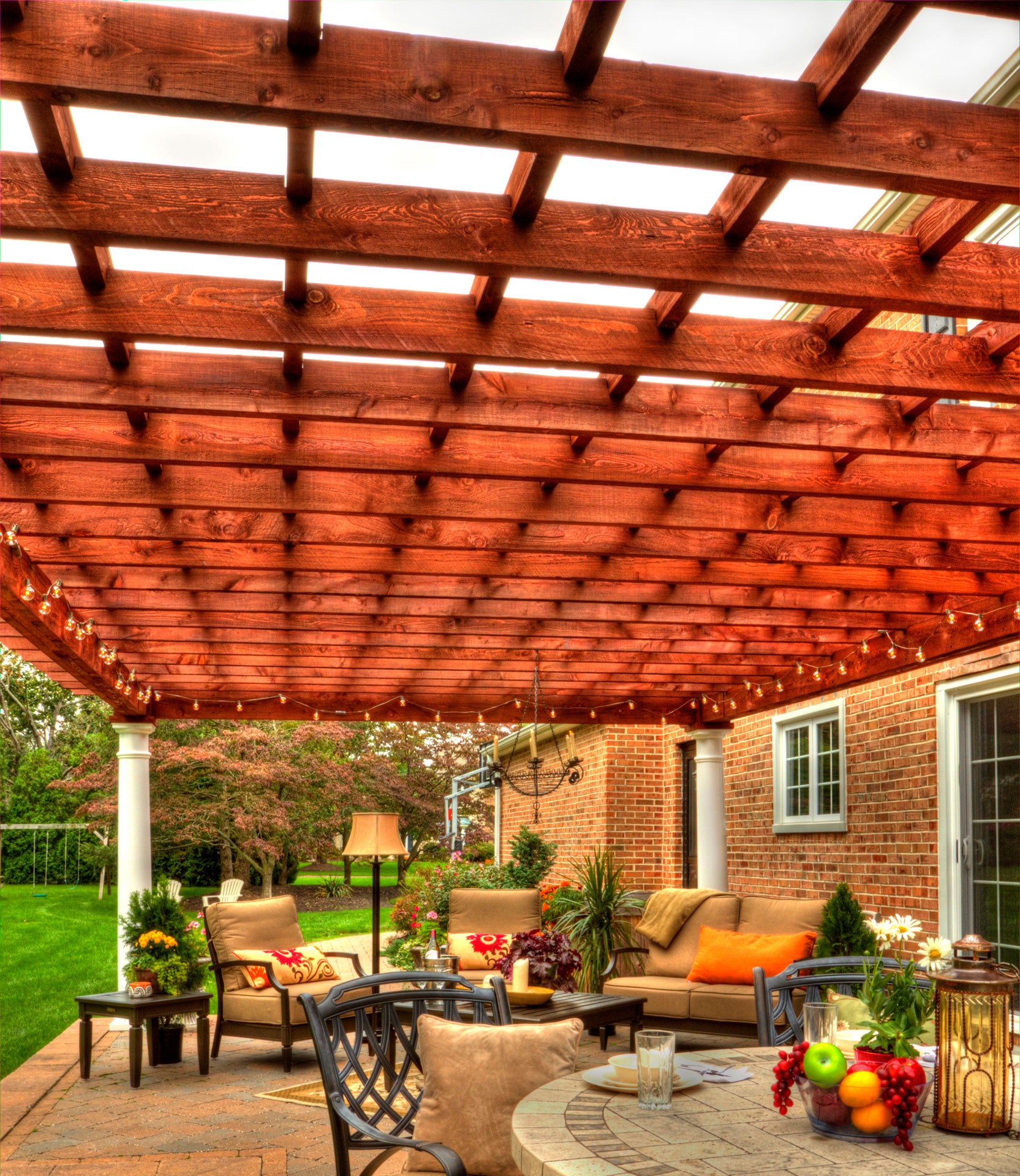Our pergolas are made of pressure-treated pine, which is unstained and ready to be painted or stained to your liking. The posts are made of solid laminated 5x5 boards, with 2x6 joists on the shorter sides and 2x4 runners on the longer sides. All sides have notched intersections and scalloped ends that help the wood resist warping. Rigidity is provided by the heavy-duty 2x6 headers coupled with braces, and the included mounting bracket allows the pergola to be attached to any wood deck or concrete pad. Our Wood Pergolas are built to be beautiful and long lasting.
